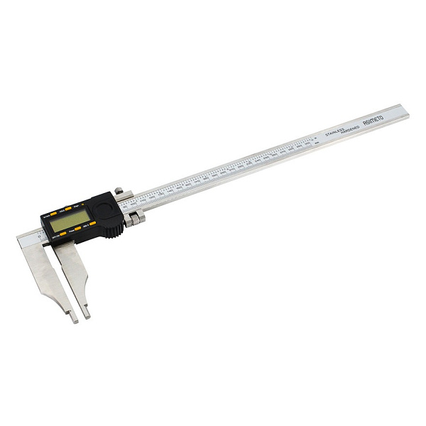 Цифровой штангенциркуль ASIMETO 315-12-6 для измерения наружных и внутренних размеров. При работе с цифровыми штангенциркулями результат измерений отображается на дисплее. Инструмент используют, когда данные необходимо получить быстро, без расчёта дополнительных шкал.