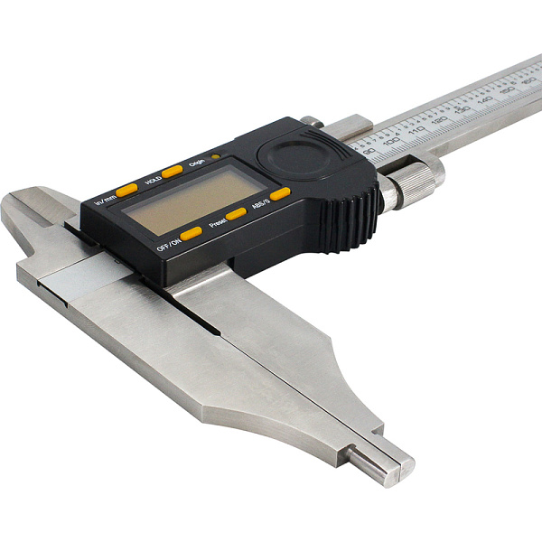 Цифровой штангенциркуль ASIMETO 315-12-8-П для измерения наружных и внутренних размеров. При работе с цифровыми штангенциркулями результат измерений отображается на дисплее. Инструмент используют, когда данные необходимо получить быстро, без расчёта дополнительных шкал.