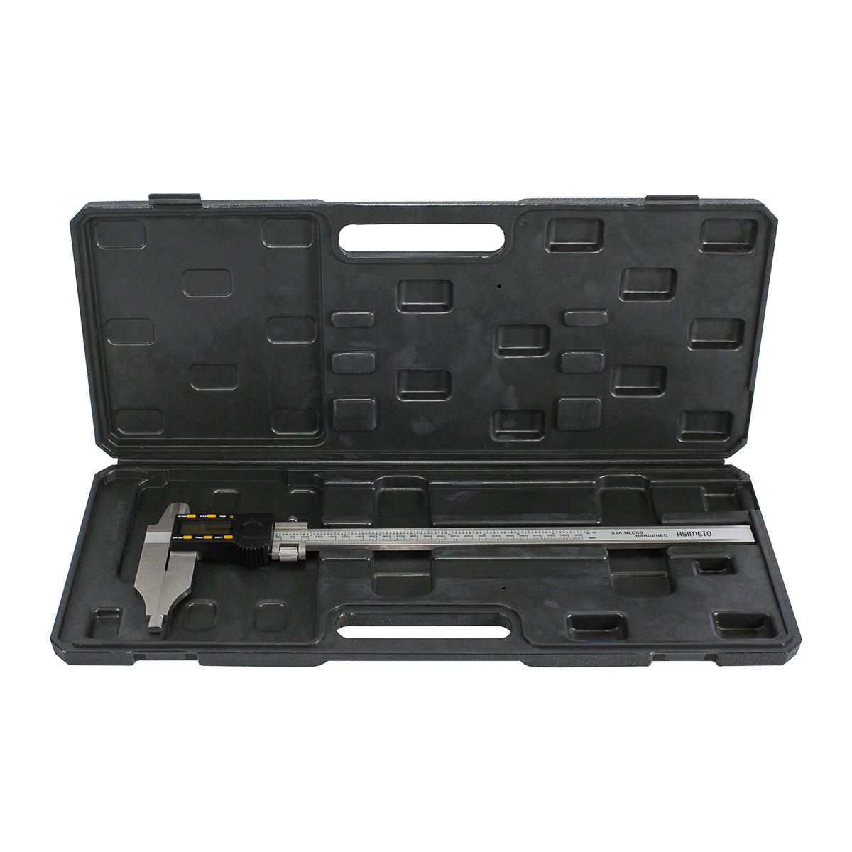Цифровой штангенциркуль ASIMETO 315-12-8 для измерения наружных и внутренних размеров. При работе с цифровыми штангенциркулями результат измерений отображается на дисплее. Инструмент используют, когда данные необходимо получить быстро, без расчёта дополнительных шкал.