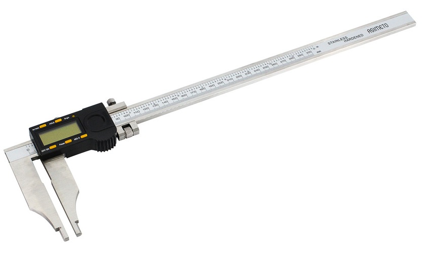 Цифровой штангенциркуль ASIMETO 315-24-6 для измерения наружных и внутренних размеров. При работе с цифровыми штангенциркулями результат измерений отображается на дисплее. Инструмент используют, когда данные необходимо получить быстро, без расчёта дополнительных шкал.