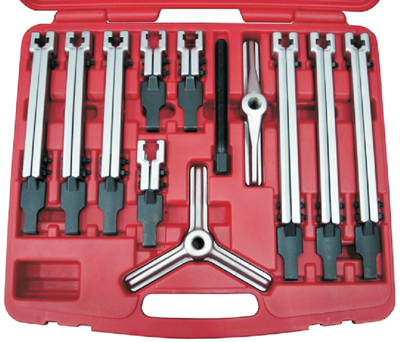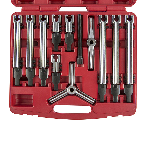 Набор съемников с двумя и тремя узкими захватами Licota ATB-1141I “американского” типа. Комплект из 12 предметов в пластиковом кейсе для демонтажа подшипников, шкивов, зубчатых колес и других деталей, имеющих посадку с натягом. Ширина захвата - до 140 мм.