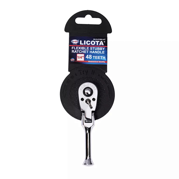 Трещотка шарнирный короткий Licota ALH-01082 для откручивания/закручивания гаек и болтов при обслуживании автомобилей и другой техники в домашних и автослесарных мастерских, на производствах или СТО. Предназначен для использования с торцевыми головками, головками со вставками, битами (через адаптер).