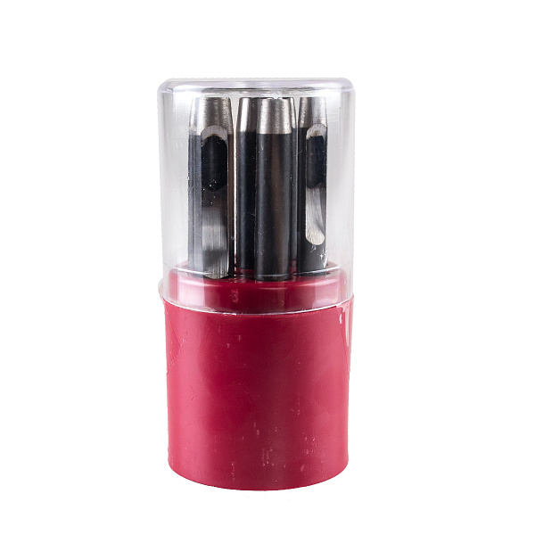 Вертикальный держатель с прозрачной крышкой облегчает хранение, транспортировку и выбор нужного инструмента. Каждый пробойник располагается в отдельном отверстии футляра.