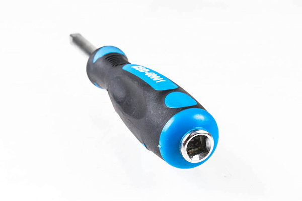 Двухкомпонентная эргономичная рукоятка (полипропилен и TPR) исключает возможность выскальзывания инструмента из рук. На торце рукоятки - квадратное отверстие под вороток ¼ дюйма, что позволяет использовать вороток в качестве удлинителя или применять трещотку для ускорения процесса откручивания/закручивания.
