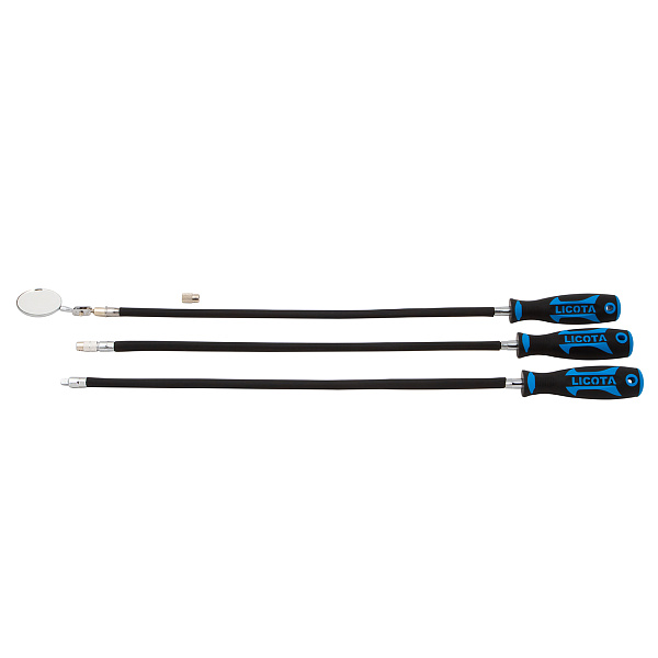 Набор гибких отвёрток Licota ATN-1046 под различные насадки с размером привода ¼ дюйма. В комплект входят 4 предмета: отвертка с приводом под биты, отвертка с приводом под торцевые головки, магнит на гибкой ручке, регулируемое зеркало. Длина гибких жал отверток - 500 мм.