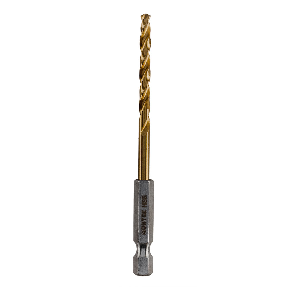 Изготовлено из быстрорежущей стали HSS-G (Р6М5 шлифованные). Покрытие нитридом титана (TiN) увеличивает срок службы, снижая нагрев при сверлении и повышая поверхностную твердость сверла. Шестигранный хвостовик ¼” HEX - E (6.35 мм) исключает проворачивание в патроне и позволяет эффективнее использовать сверло с дрелью, шуруповертом, винтовертом.