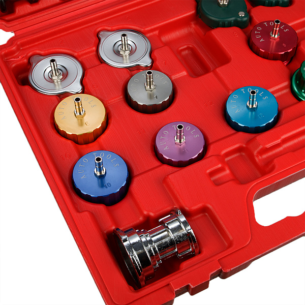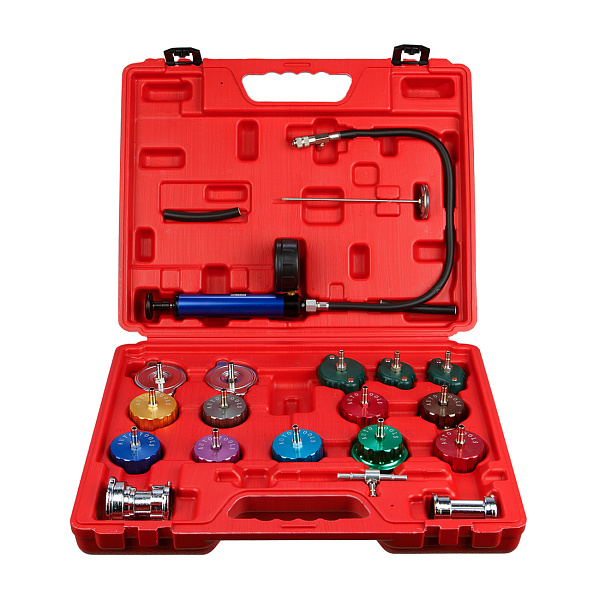 Набор для проверки радиатора предназначен для обнаружения возможных утечек в радиаторах охлаждающей системы двигателя, а также в прочих элементах машины, связанных с прохождением через них жидкости.