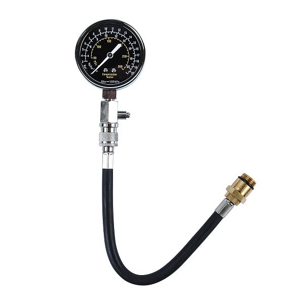 Наличие гибкого шланга позволяет производить измерения в ограниченном пространстве. Компрессометр вкручивается в свечное отверстие, а не прижимается к нему, что способствует наиболее точному измерению.