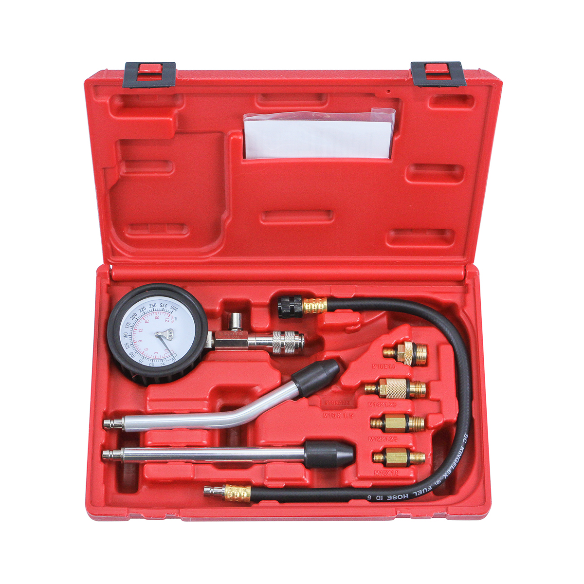 Набор из 8 предметов в пластиковом кейсе предназначен для измерения давления бензиновых двигателей легковых автомобилей и мотоциклов. Позволяет диагностировать герметичность камеры сгорания путем измерения компрессии (максимального давления воздуха) в камере сгорания в конце такта сжатия.