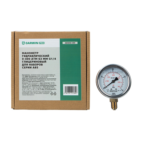 Манометр гидравлический A85650-400 GARWIN PRO 0-400 атм 63 мм G1/4 глицериновый для наборов серии A85 подходит для использования в качестве запасной части к наборам GARWIN PRO A85530, A85540, A85530, а также к гидравлическим прессам.