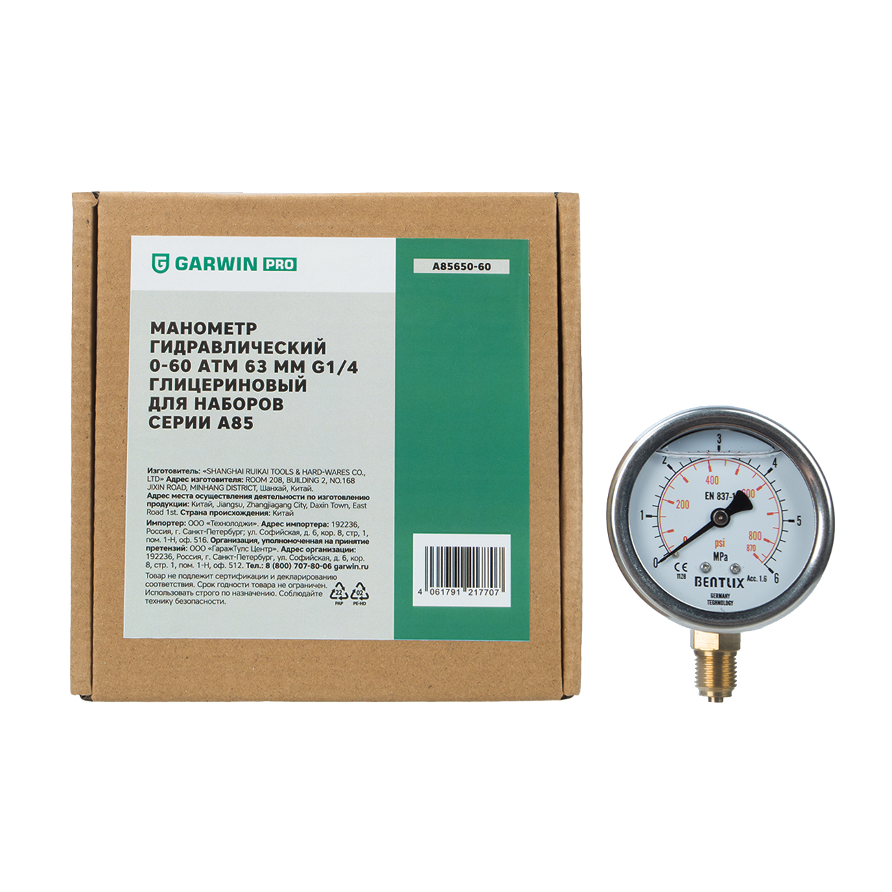 Манометр гидравлический A85650-60 GARWIN PRO 0-60 атм 63 мм G1/4 глицериновый для наборов серии A85 подходит для использования в качестве запасной части к наборам GARWIN PRO A85530, A85540, A85530, а также к гидравлическим прессам.