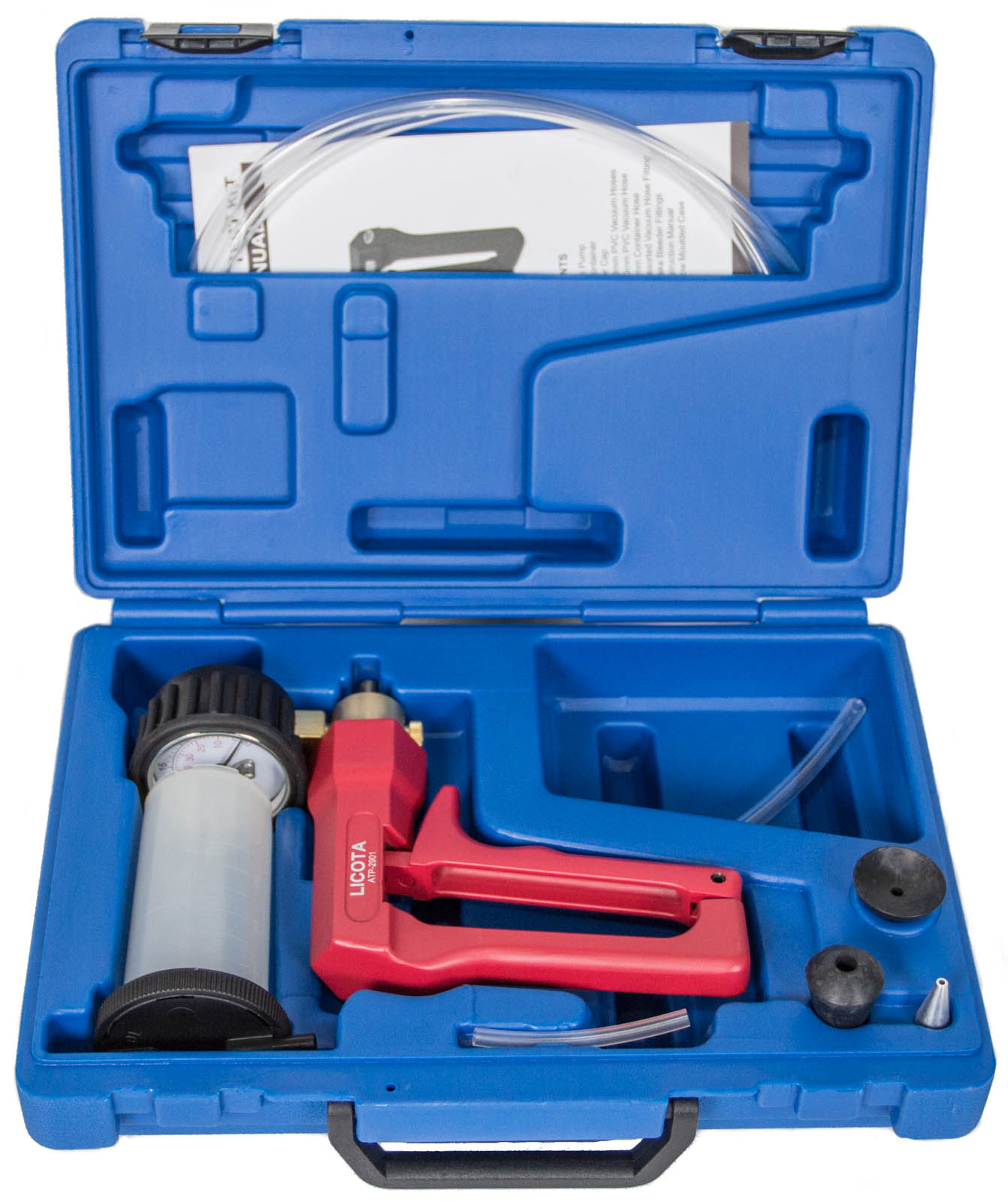 Комплект из 22 предметов в пластиковом кейсе позволяет создавать разрежение при проведении проверок от 0 до -1 кг/см² (атм).