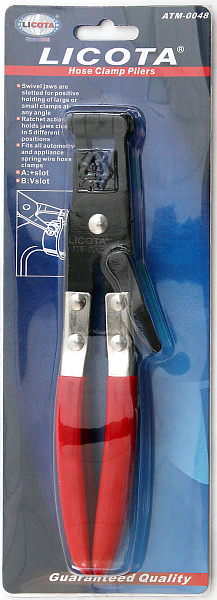 Предназначены для работы с многоразовыми самозажимными пружинными хомутами топливных, масляных и водяных шлангов. Поворотные губки обеспечивают доступ к труднодоступным хомутам. Трещоточный механизм с 5-ю положениями позволяет зафиксировать хомут в разжатом состоянии. Губки клещей имеют прорези формы "V".