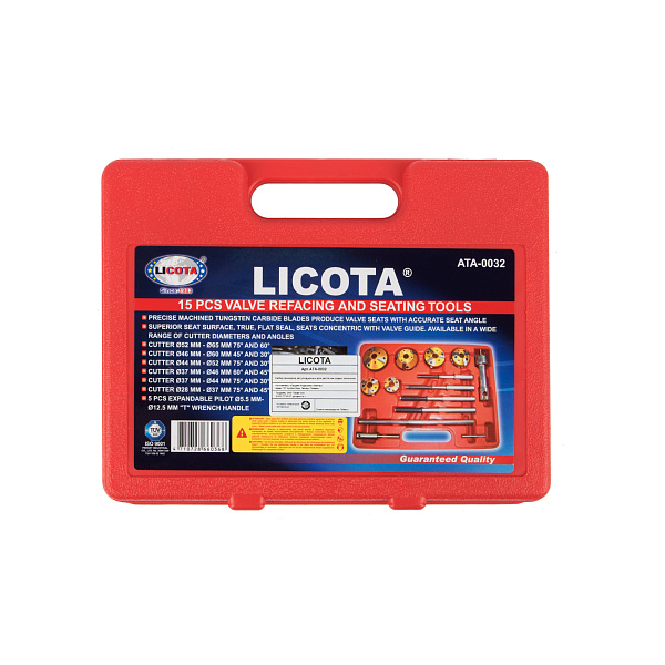 Набор регулируемых зенкеров для расточки седел клапанов Licota ATA-0032 из 14 предметов. 6 зенкеров с твердосплавными лезвиями, 5 направляющих втулок, держатель зенкеров, вороток для держателя и Г-образный ключ.