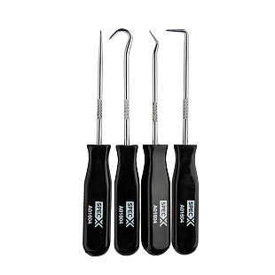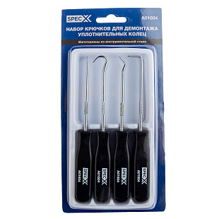 Комплект из 4-х крючков разной конфигурации со съемной рукояткой используется для работ с различными типами сальников.