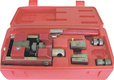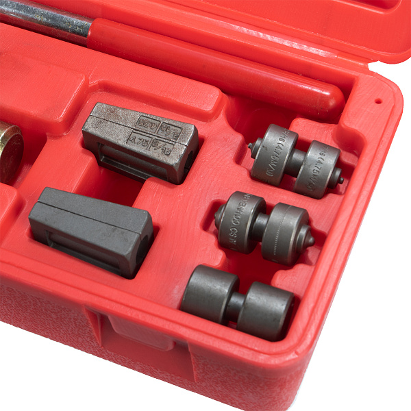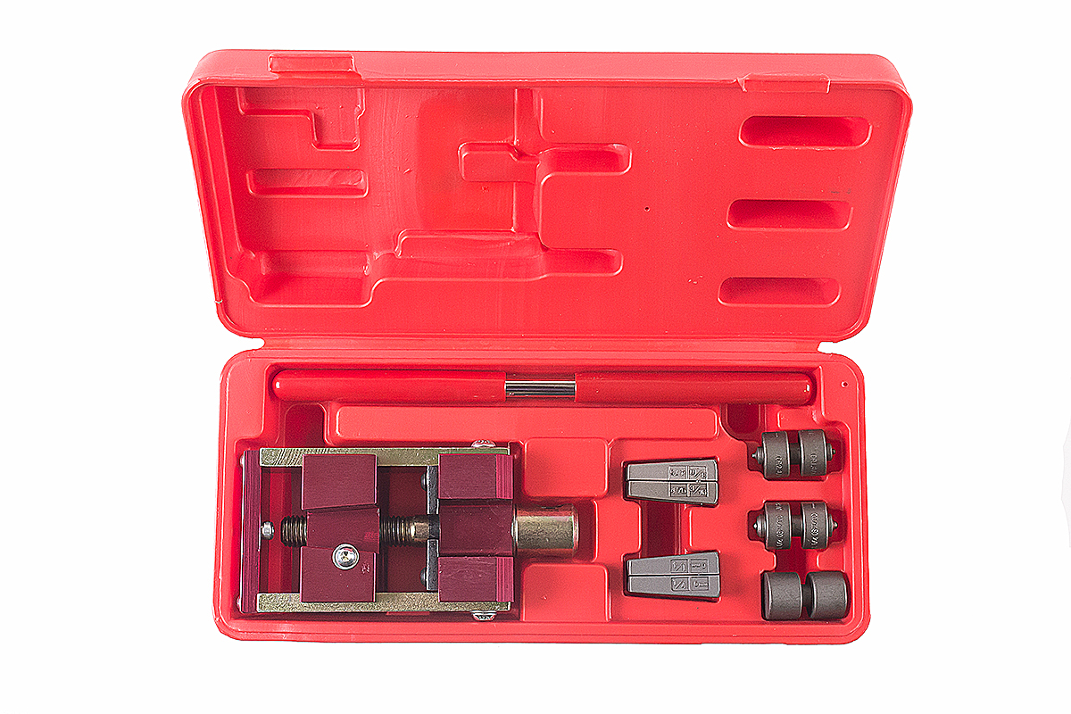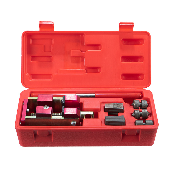 Комплект из 6 предметов в пластиковом кейсе предназначен для работ с тормозной системой, системой питания и кондиционирования. Приспособление в виде тисков с поворотным конусным винтом применяется для развальцовки стальных, алюминиевых и медных трубок при ремонте и обслуживании автомобилей.