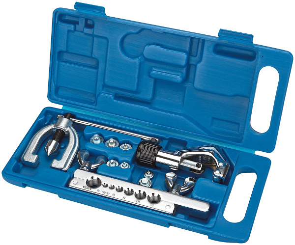 Комплект из 10 предметов в пластиковом кейсе включает в себя набор для развальцовки трубок и труборез. Предназначен для работ с тормозной системой, системой питания и кондиционирования.