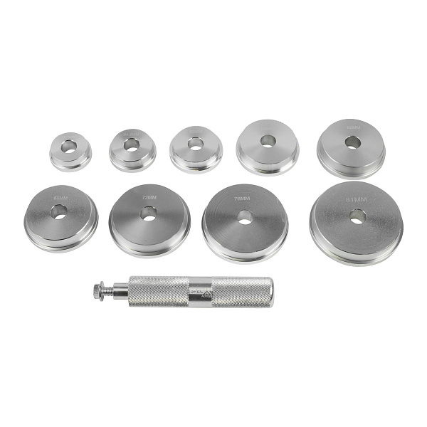 Набор оправок для запрессовки сальников, подшипников и сайлентблоков SPECX A01628. Девять оправок диаметром от 39,75 до 80,8 мм и съемная рукоятка.