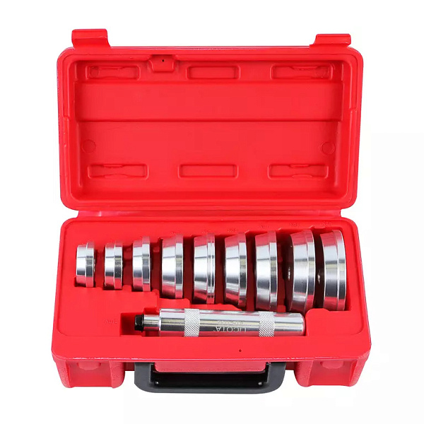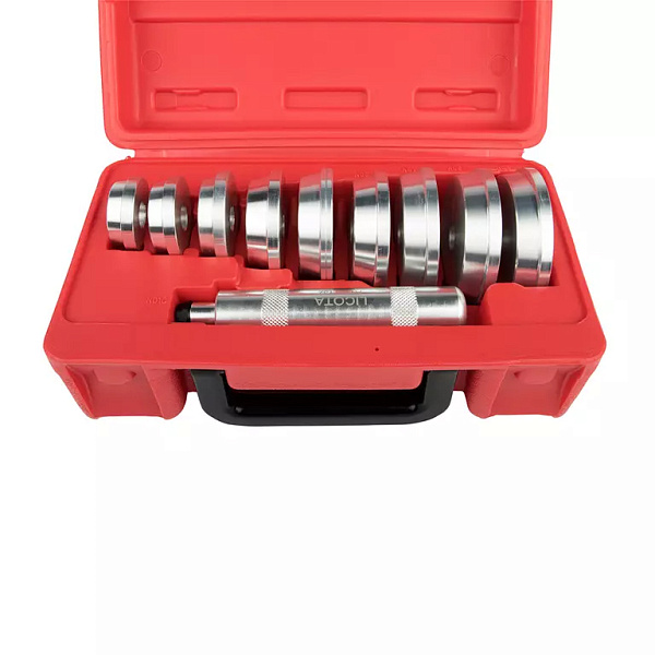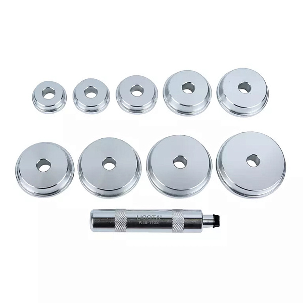 Набор оправок для запрессовки сальников, подшипников и сайлентблоков Licota ATB-1132. Девять оправок диаметром от 39,75 до 80,8 мм и съемная рукоятка.