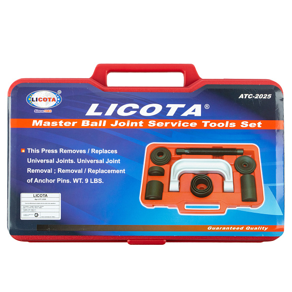 Набор для монтажа и демонтажа шаровых шарниров Licota ATC-2025 универсальный. Комплект из 9 предметов в пластиковом кейсе. Подходит для шаровых большинства легковых автомобилей, легкого коммерческого транспорта и полноприводных автомобилей.