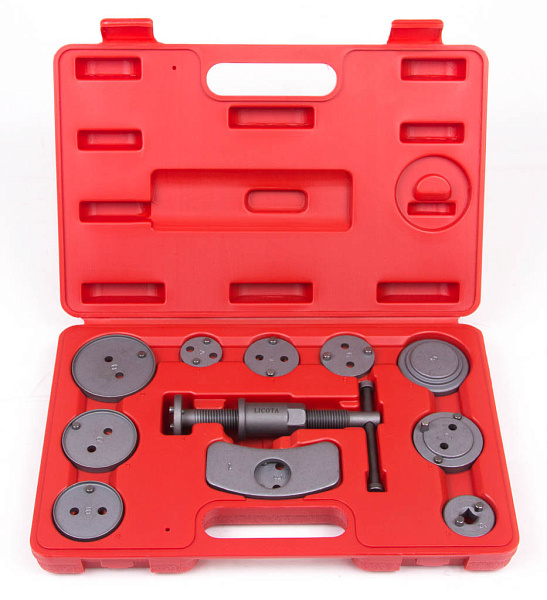 Подходящая по размеру чашка вставляется в суппорт и выжимает тормозной цилиндр. Комплект из 11 предметов поставляется в пластиковом кейсе.