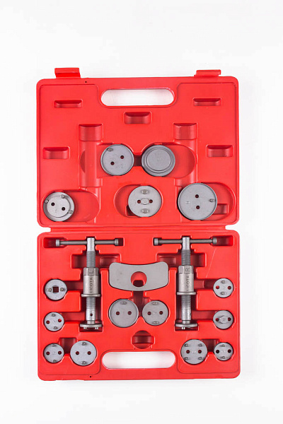 Подходящая по размеру чашка вставляется в суппорт и выжимает тормозной цилиндр. Комплект из 18 предметов поставляется в пластиковом кейсе.