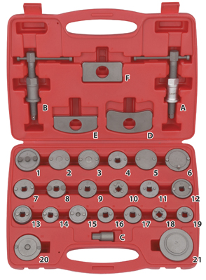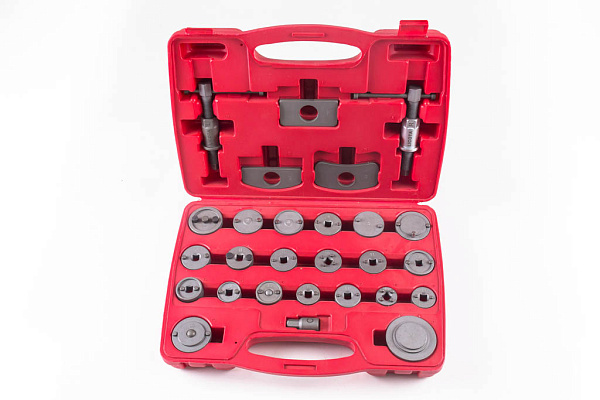 Подходящая по размеру чашка вставляется в суппорт и выжимает тормозной цилиндр. Комплект из 27 предметов поставляется в пластиковом кейсе.