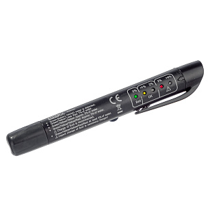 Тестер выполнен в виде обычной ручки с пластиковым зажимом, что позволяет носить его в кармане рабочей униформы.