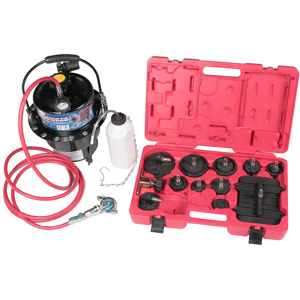 Приспособление позволяет производить замену тормозной жидкости быстро, просто и чисто. Подходит для большинства тормозных систем с ABS и без. Оптимальная конструкция приспособления позволяет одному человеку выполнять все операции с инструментом. Устройство может накапливать сжатый воздух, что позволяет использовать его автономно. Приспособление поставляется в комплекте с адаптерами для бачков разной конфигурации.