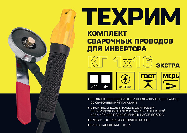 Кабель КГ 1х16 рассчитан на ток до 300А, изготовлен по ГОСТу, 100% медь, морозостойкий, возможно использование при температуре от -30 до +50. Длина обоих кабелей составляет 5 метров. Имеет кабельную вилку 10-25.